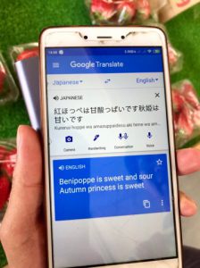 通訳の foo Edmundさんと『スマホ』のアプリを使って商品の説明。(秋姫→章姫入力ミス)